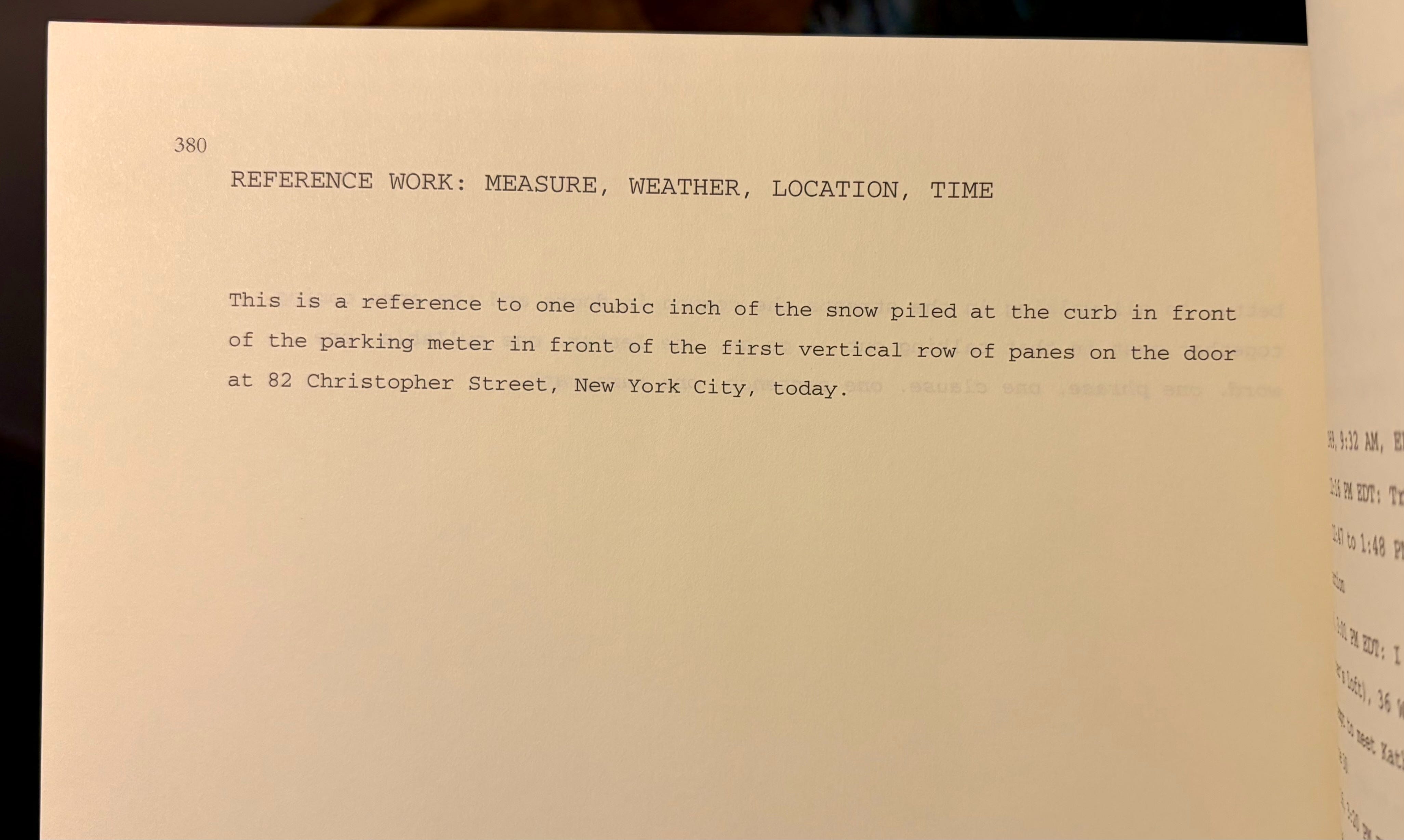 This paradox, in which the particular gets more and more singular and specific just as it slips away from us, or requires another pair of eyes to confirm what we are seeing, deepens when we face up to how fragile the singular image can be. Vito Acconci’s “Reference Work: Measure, Weather, Location, Time” feels as cut and dry as is possible for a reference work: it picks out “one cubic inch of […] snow” and, like Bronk’s zip code, gives us enough description to, in theory, spatially locate this tiny white cube on the streets of NYC. But also like Bronk’s poem, we are stopped cold with the closing indexical: today. Acconci’s spatial description baroquely folds in triangulating references to so many surrounding objects—the curb, the parking meter, even individual panes on the door—but the “Time” in Acconci’s title is trusted entirely to a word that must be inhabited by a writer, a speaker, or perhaps a viewer. This single person, like Bronk’s aspirational letter-writer/addressee, has to hold the parallax view of the particular space of the poem and play a kind of external role, one of attestation—that what’s described in the piece is actually there, that it can be found.