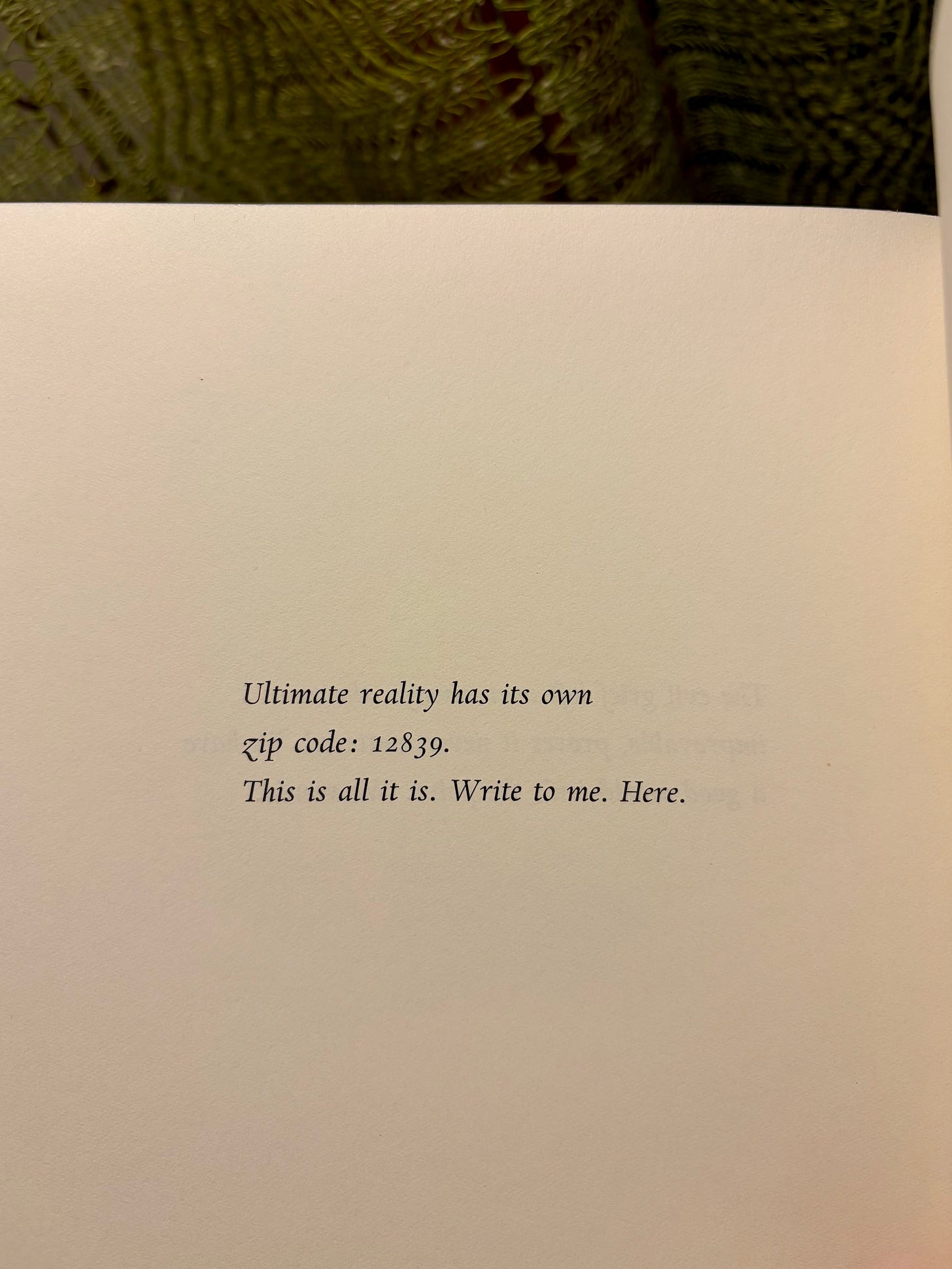Why would ultimate reality need to be written to? Is it ultimate but somehow insufficient? Also, I love the way this little poem ends: Here. For a long time I read that Here as being entirely a recapitulation of the zip code from the previous line, only this time indexed by the speaker: a zip code stays in one place even if the speaker leaves it (or dies), but the Here requires somebody fixing the reference of the adverb, like what in type theory is called a witness. Lately, though, I also want to read this little word—needless to say, homophonous with hear—as the same word you would say if you were handing someone blank paper and a writing utensil with which to write a letter. Here, like G.E. Moore’s Here is one hand. It presupposes an audience you want to talk to, write to, prove something to. Or that you want to give something to.